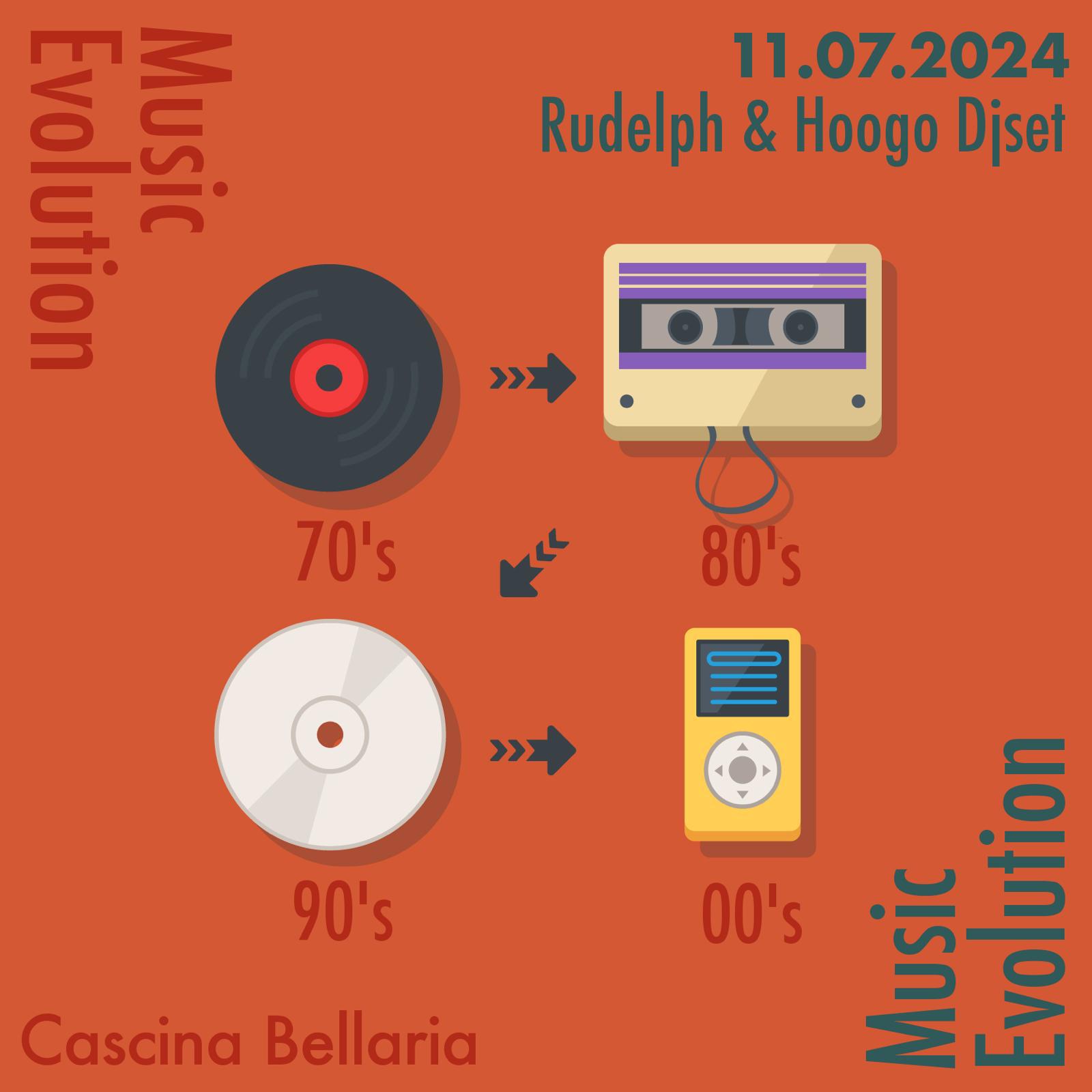 Music Evolution. Un viaggio spazio-temporale sonoro dagli anni 70 ai 2000 che ripercorre le tappe più conosciute e più nascoste della musica. Djset di Rudelph & Hoogo.